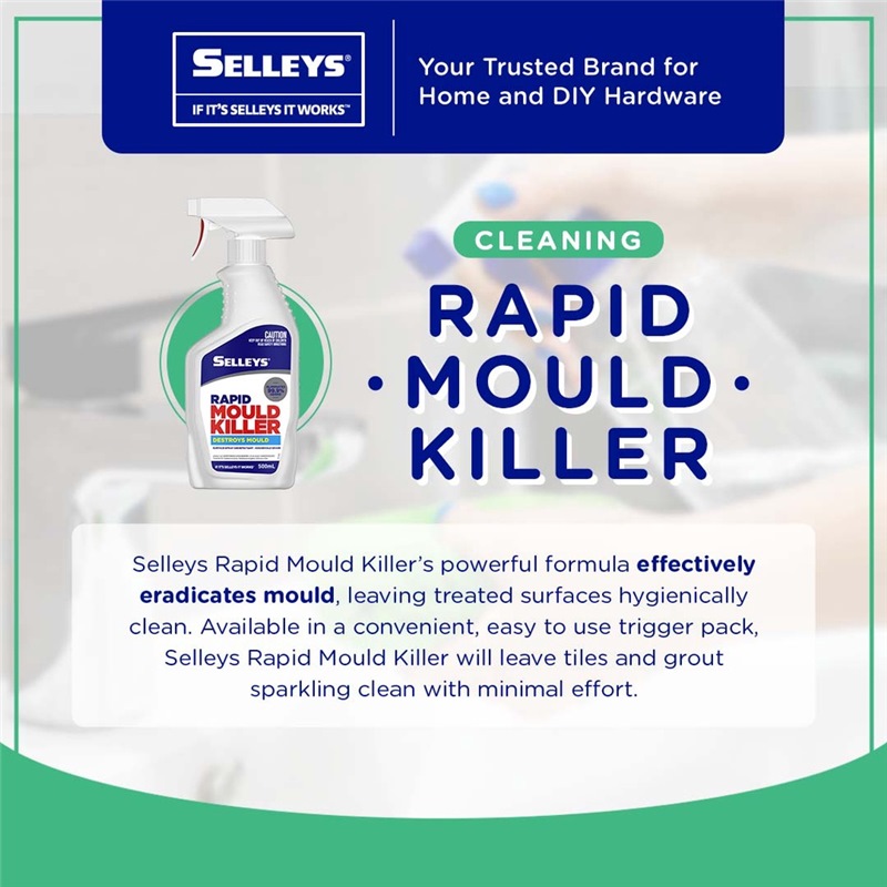 Selleys Rapid Mould Killer’s powerful formula effectively eradicates mould, leaving treated surfaces hygienically clean. Available in a convenient, easy to use trigger pack, Selleys Rapid Mould Killer will leave tiles and grout sparkling clean with minimal effort.