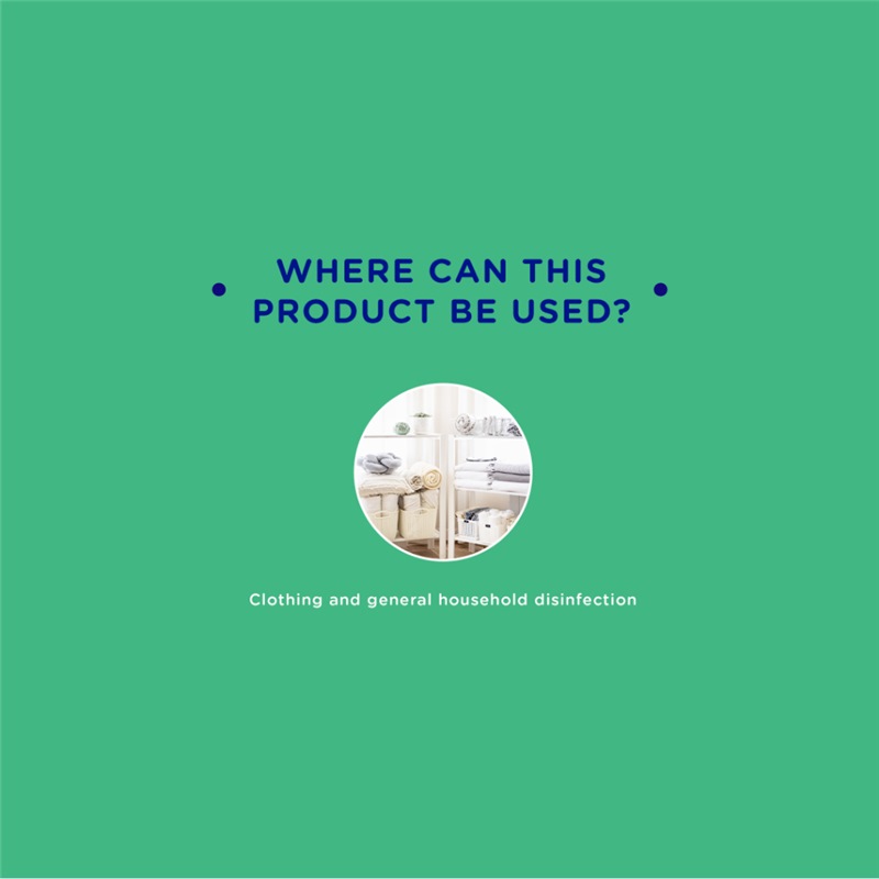 Dilute 1 part of product with 50 parts of water, and use it for disinfection of clothings or cleaning of surfaces, leaving the solution on for at least 15 minutes.