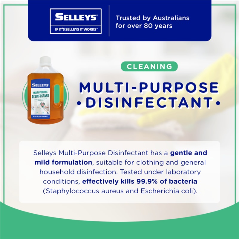 Selleys Multi-Purpose Disinfectant has a gentle and mild formulation, suitable for clothing and general household disinfection. Tested under laboratory conditions, effectively kills 99.9% of bacteria (Staphylococcus Aureus and E.coli).