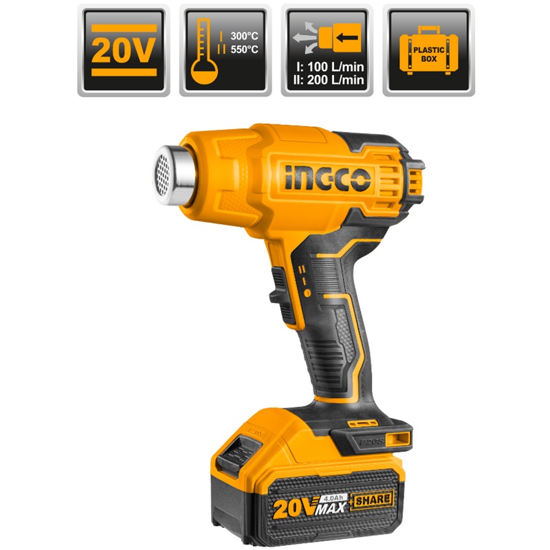 INGCO 20V LI-ION HEAT GUN 300/550°C 1X4.0AH + CHARGER & CASE HGLI20025
