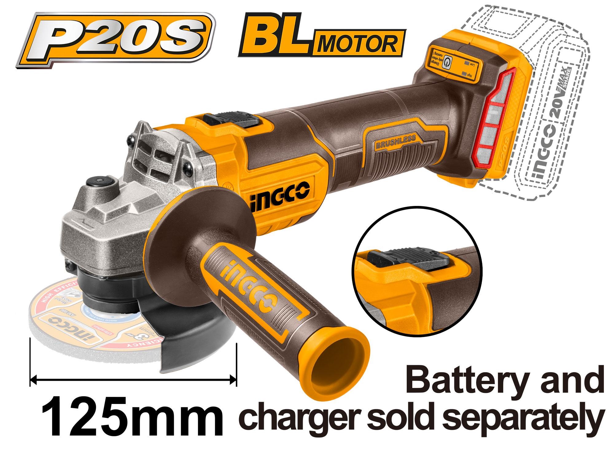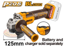 Home » Power Tools - Cordless » Bare Units » INGCO 20V LI-ION BRUSHLESS ANGLE GRINDER 5"125MM VARIABLE SPEED CAGLI201258 (BARE UNIT)