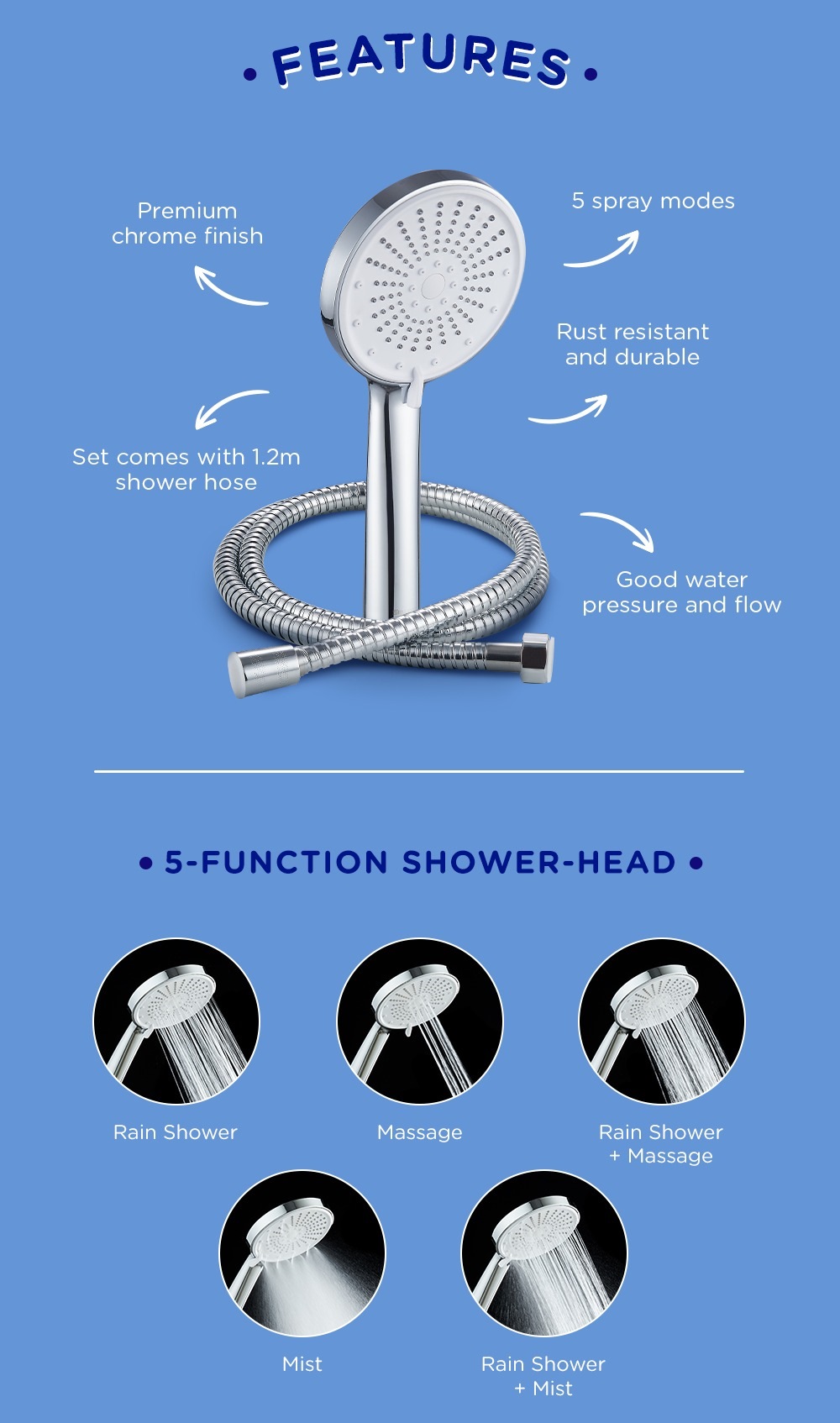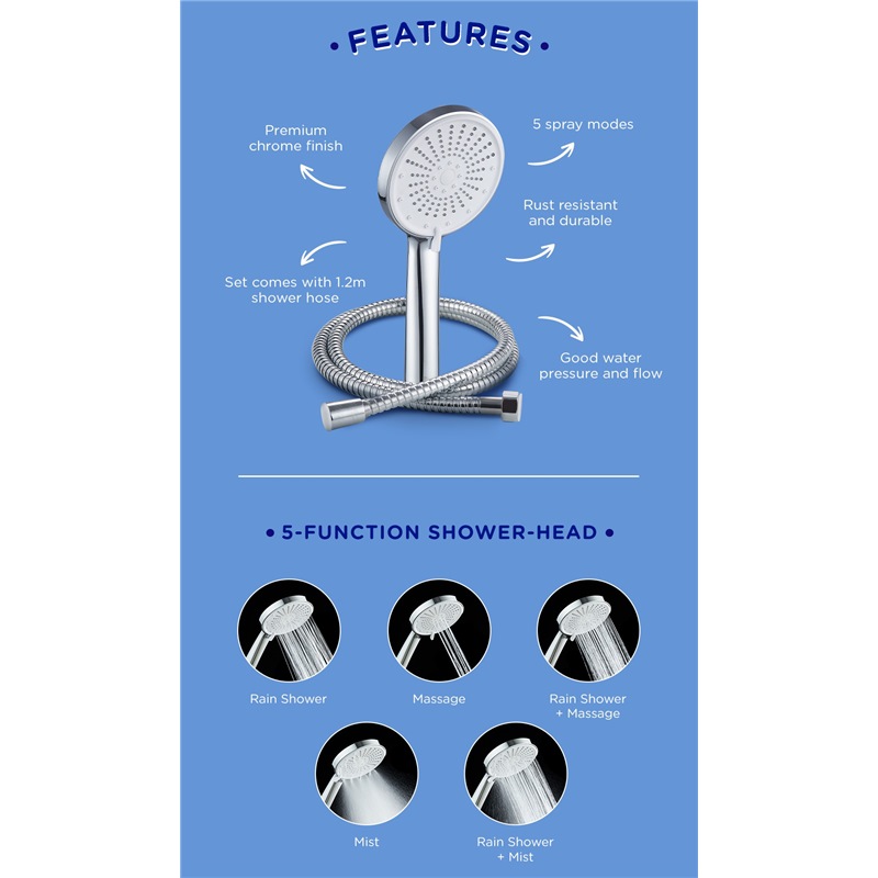 Selleys Premium Chrome Shower Head/Set – 5 Functions is a shower head that has 5 types of spray modes and can improve water pressure.