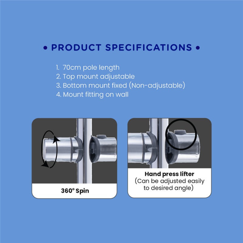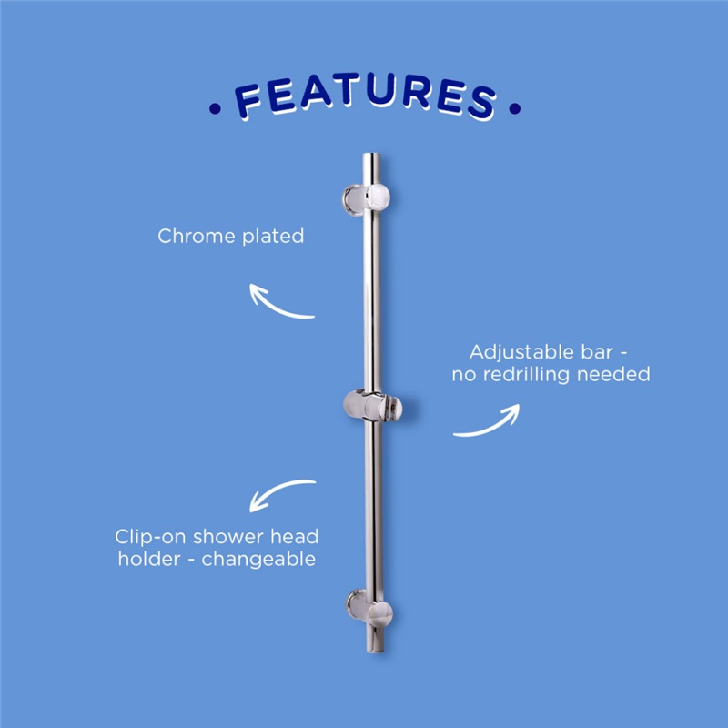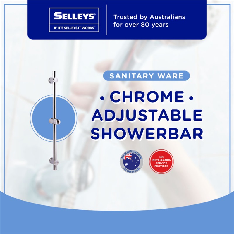 Selleys Chrome Adjustable Showerbar is chrome plated, and has an adjustable shower bar and clip-on shower head holder.