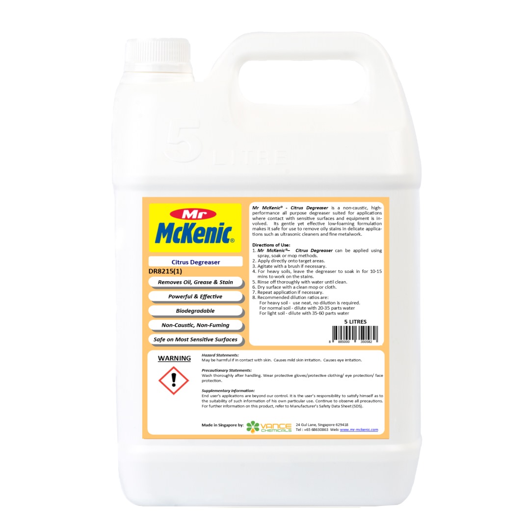 Mr McKenic®- Citrus Degreaser is a non-caustic, high-performance all-purpose degreaser that is especially suitable for applications where contact with sensitive surfaces and equipment is involved. Its gentle yet effective formula makes it safe for use in removing oily stains in delicate applications such as ultrasonic cleaners and fine metalwork.