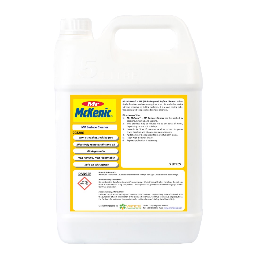 Mr McKenic® - MP (Multi-Purpose) Surface Cleaner effectively dissolves and removes grime, dirt, oils and other stains without marring or dulling surfaces. It is a cost saving solution compared to specialized surface cleaners.