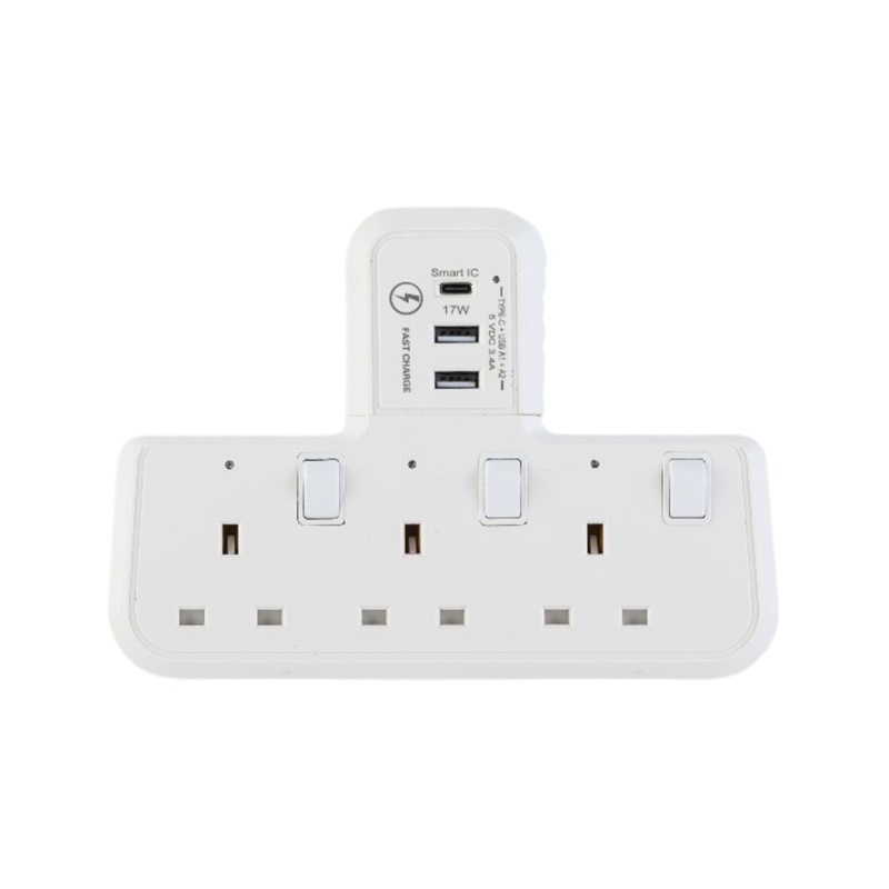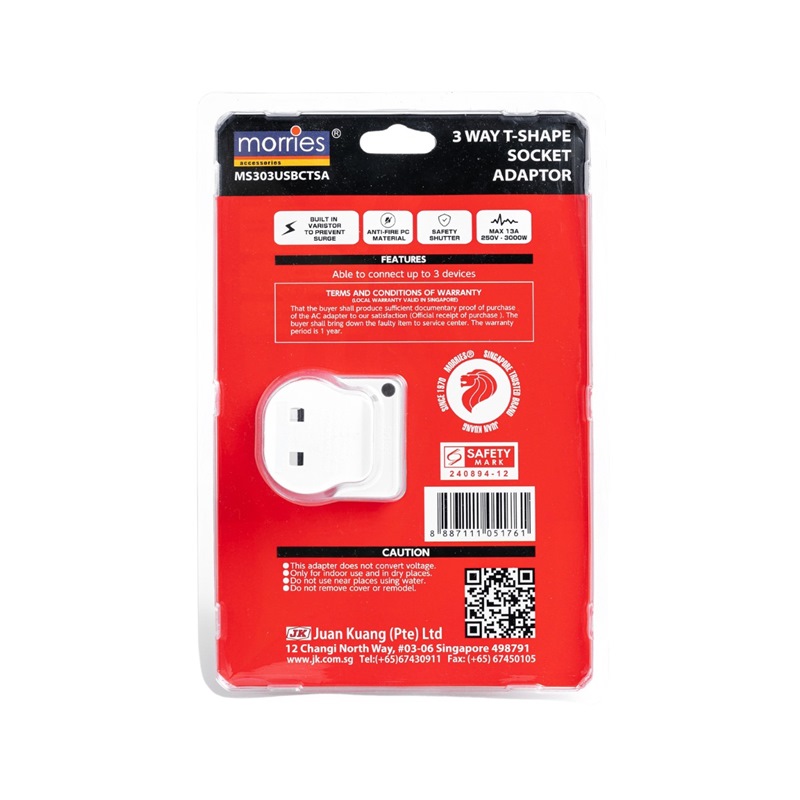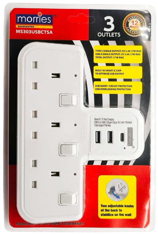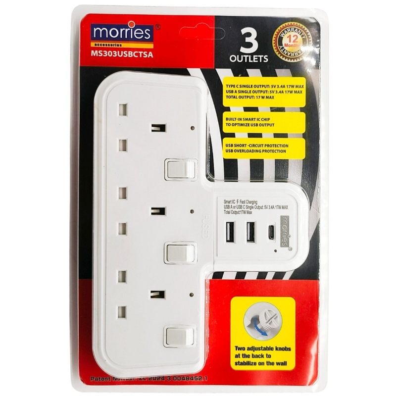 Home » Electrical & Lighting » Extension Cords & Travel Adaptors » MORRIES T-SHAPE 3 WAY SOCKET ADAPTOR W/USB 2A 1C MS303USBCTSA