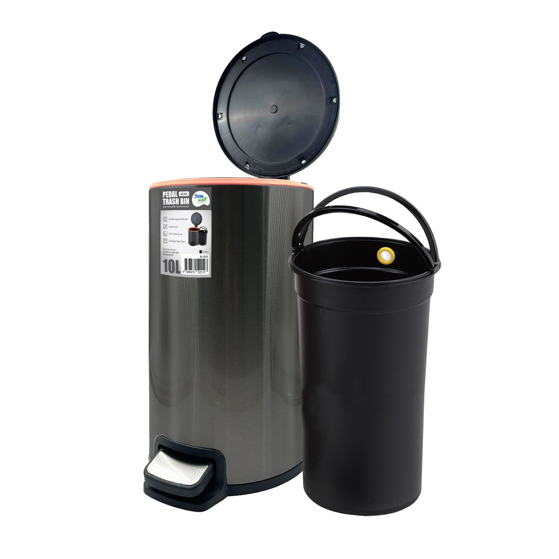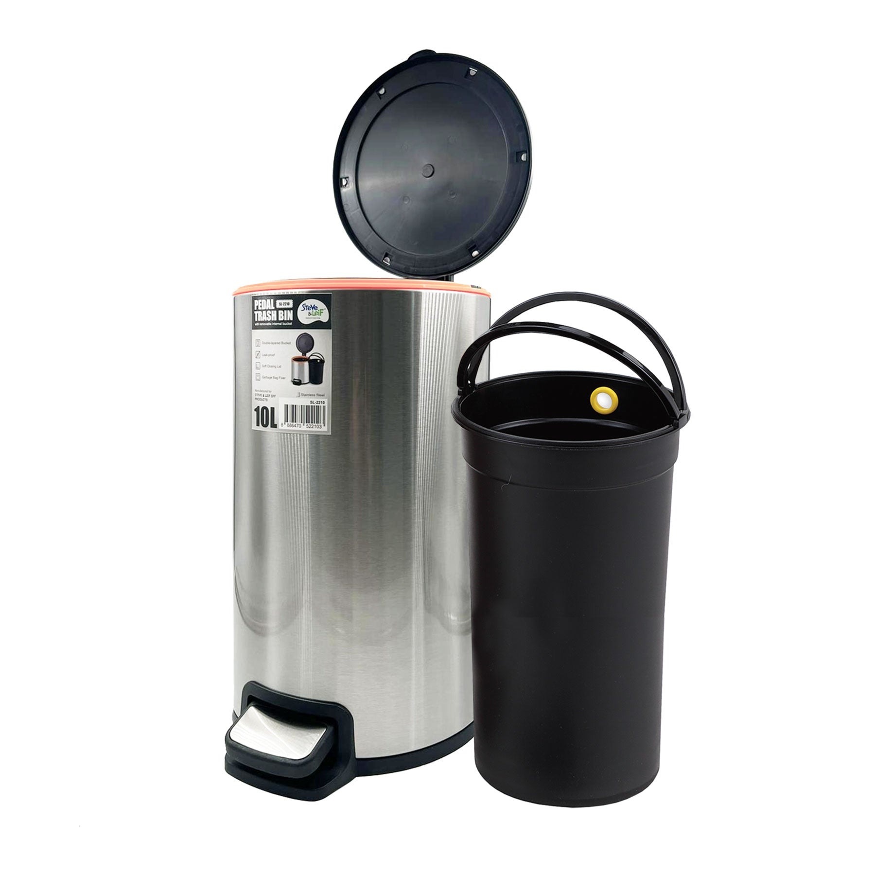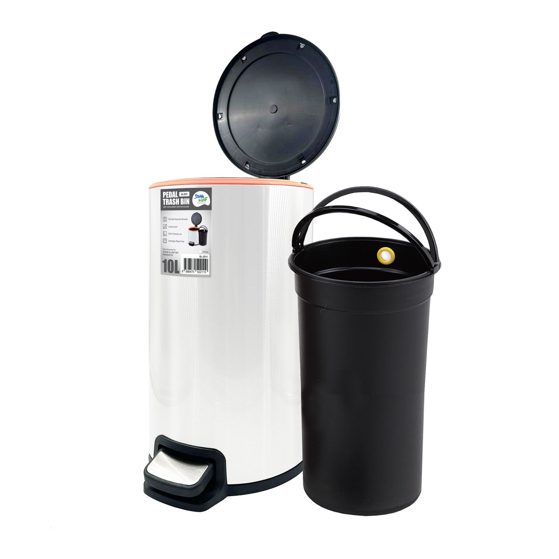 Steve & Leif Pedal Trash Bin / Waste Bin / Dustbin 10L is a circular bin. It features a strong steel pedal which engineered to last over 150,000 steps - more than 20 steps a day for 20 years. Designed with Hi-Tech coating, that is resistant to fingerprint marks and unsightly smudges. It consists of a removable bucket to easily empty the trash and clean in a hygienic way. With this bin, you don't have to worry about pests anymore. As it's leak-proof, which helps to seals the smell from escaping the bin. Ensures quietness in your home, kitchen, toilet and even office with soft closing lid. Comes with a garbage bag fixer to maintain your garbage bag upright at all times without the hassle of adjusting it.