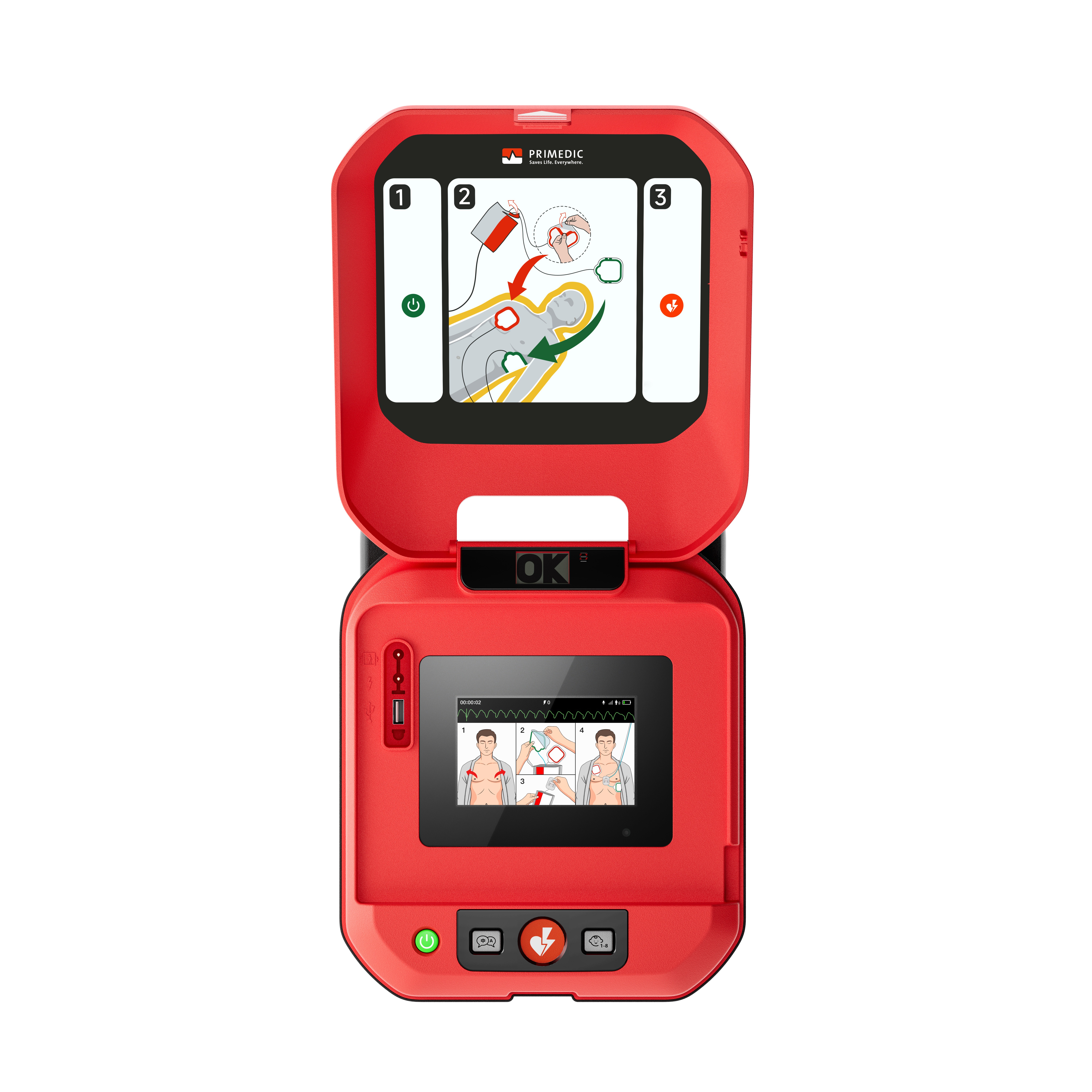 In order to be available safely and reliably at all times, the HeartSave Y carries out a comprehensive self-test every day. Here the technical condition of the AED is checked, the remaining capacity of the battery and the durability of the electrodes. Readiness is indicated by a clearly visible and intuitively understandable 'OK' displayed on the device.