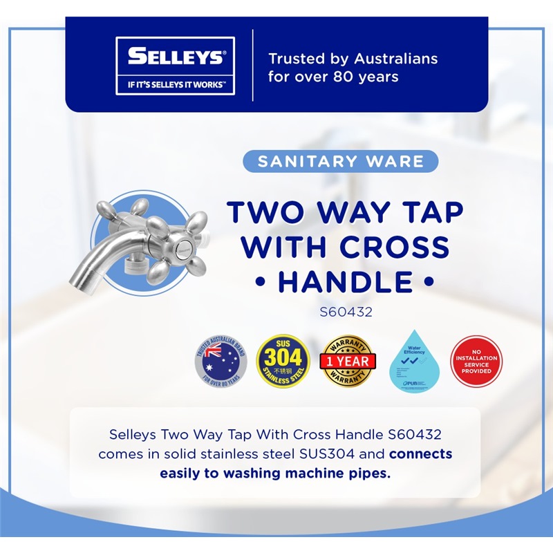 Selleys Two Way Tap With Cross Handle S60432 comes in solid stainless steel SUS304 and connects easily to washing machine pipes.