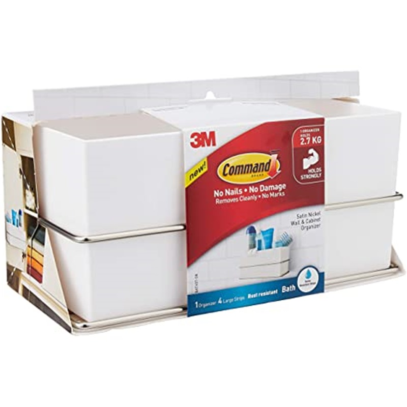 The Command ™ Bath Wall and Cabinet Organizer with a satin nickel finish are perfect for organizing your every-day items and keeping them accessible without cluttering counter space. The removable bin makes cleaning easy. The organizer sticks to many surfaces, including glass, mirror, tile, fibreglass, wood and painted surfaces. It adheres firmly and comes off leaving no holes or sticky residue, providing a great alternative to damaging screws and nails.