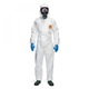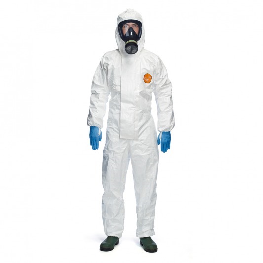 DuPont™ Tychem® 4000 S. Hooded coverall available in white, in sizes SM to 3X. Elasticated face, wrists, waist and ankles for an optimal fit, thumb loops to prevent sleeves from riding up. Self-adhesive chin flap for tight seal of suit to face-mask.
