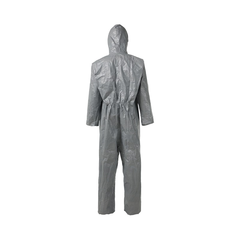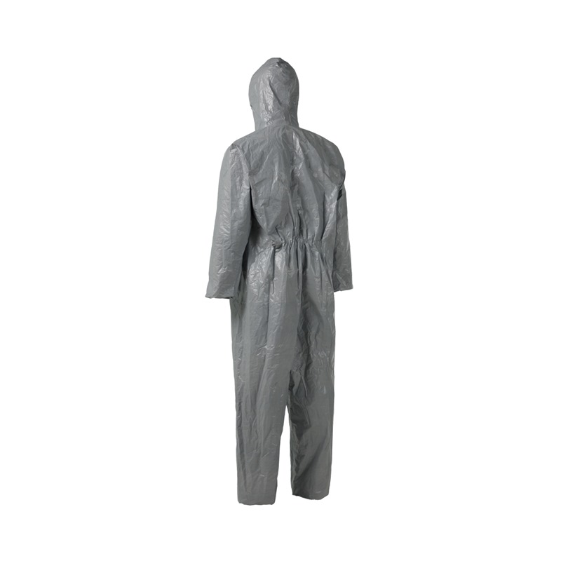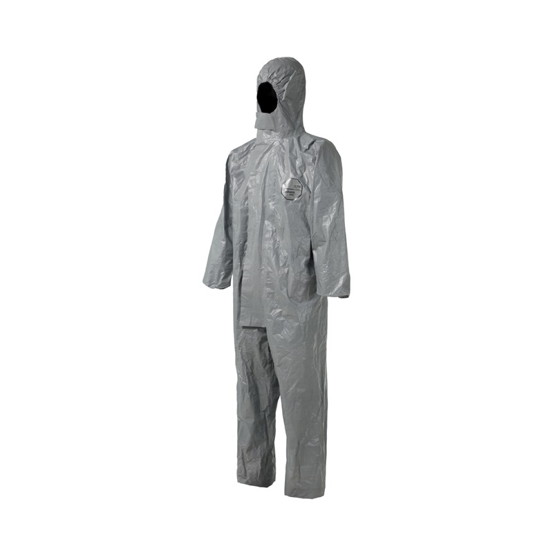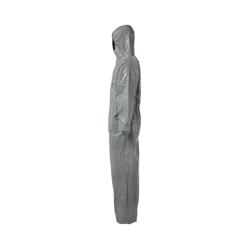 DuPont™ Tychem® F, hooded coverall. Available in grey for discretionary needs. Elasticated face, wrists, waist and ankles for an optimal fit, thumb loops prevent sleeves from riding up. Self-adhesive chin flap for tight seal of suit to face-masks.