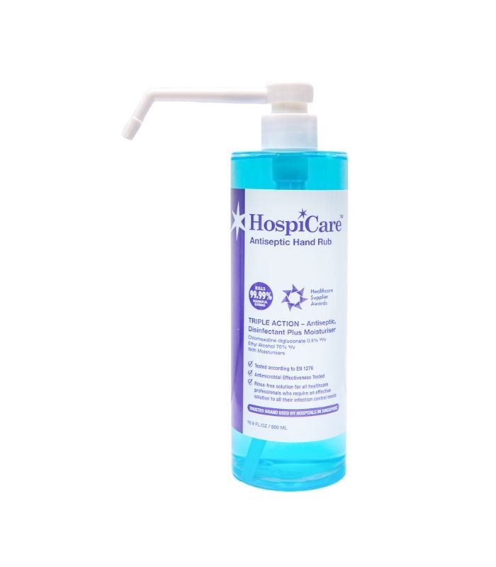 HospiCare Antiseptic Hand Rub contains 70% by volume of Ethyl Alcohol and 0.5% w/v of Chlorhexidine digluconate which helps to kill 99.99% harmful germs without soap and water. It is fast-acting and has a persistent germ-killing action. It comes in a unique “no splash” pump making it easier to dispense on hands. Tested according to EN 1276 against harmful bacteria with 1-minute contact time. It also contains moisturisers and Vitamin E making it skin-friendly. Ideal for all healthcare professionals who require an effective solution to their infection control needs when soap and water are not accessible.