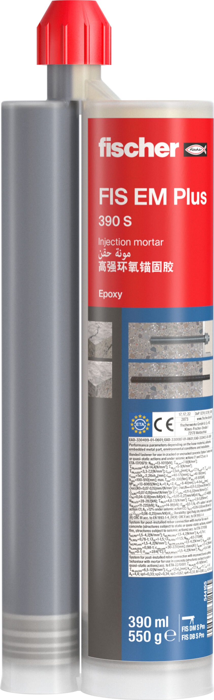 The fischer injection mortar FIS EM Plus 390 S is a high-quality epoxy resin mortar for maximum load-bearing capacity in cracked and non-cracked concrete.