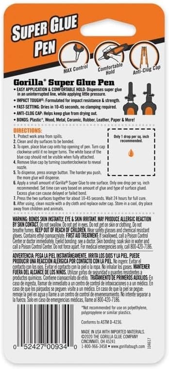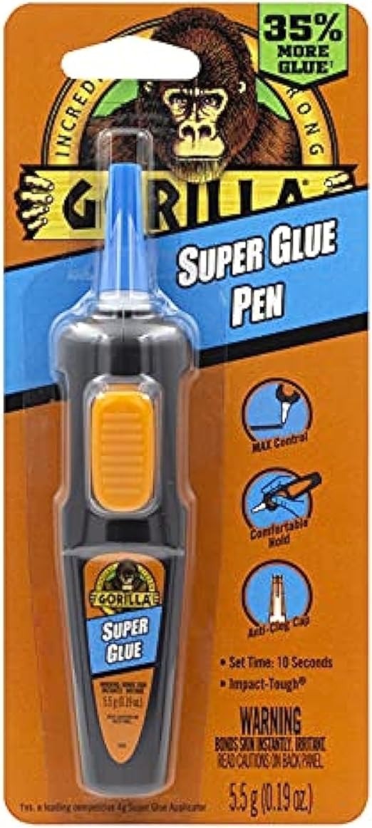 Our same strong and reliable Super Glue liquid formula, now in an intuitive pen-shaped applicator. Gorilla Super Glue Pen dispenses super glue in an uninterrupted line, providing maximum control while fitting comfortably in hand.