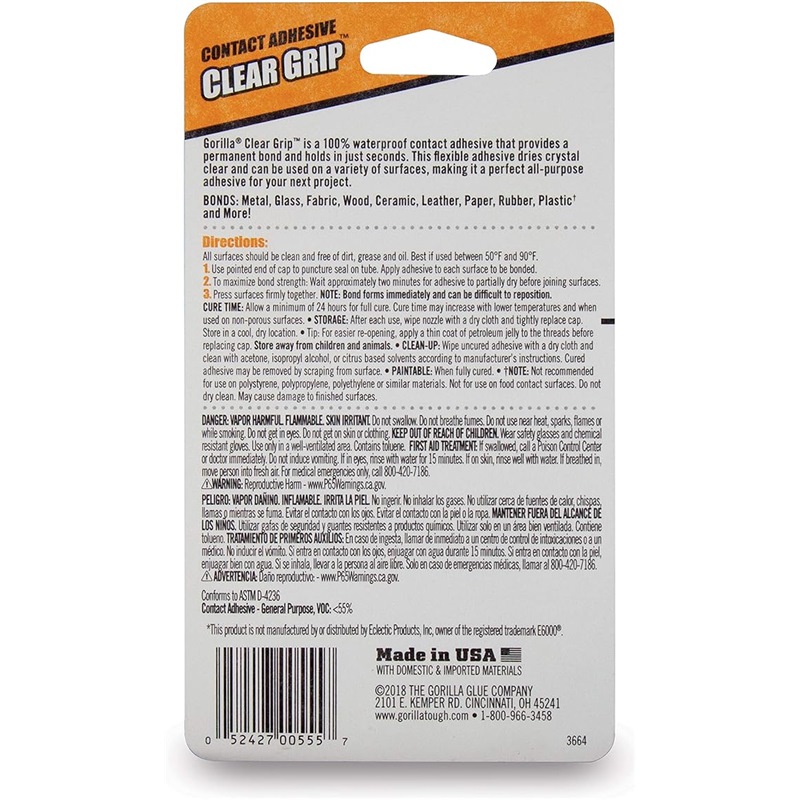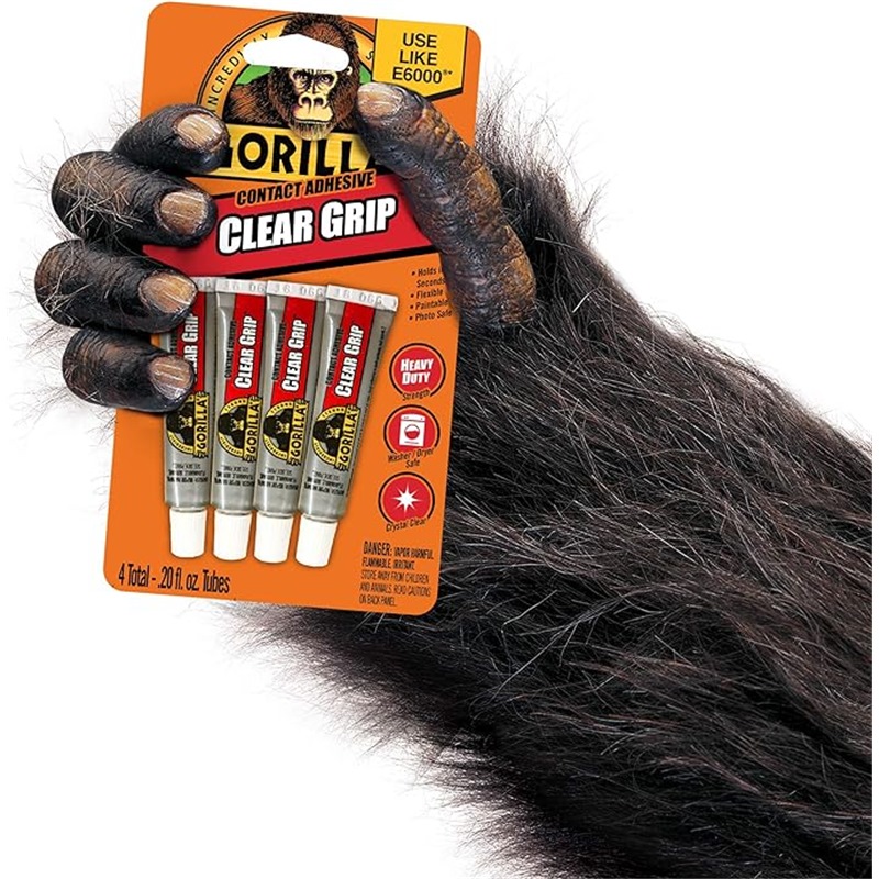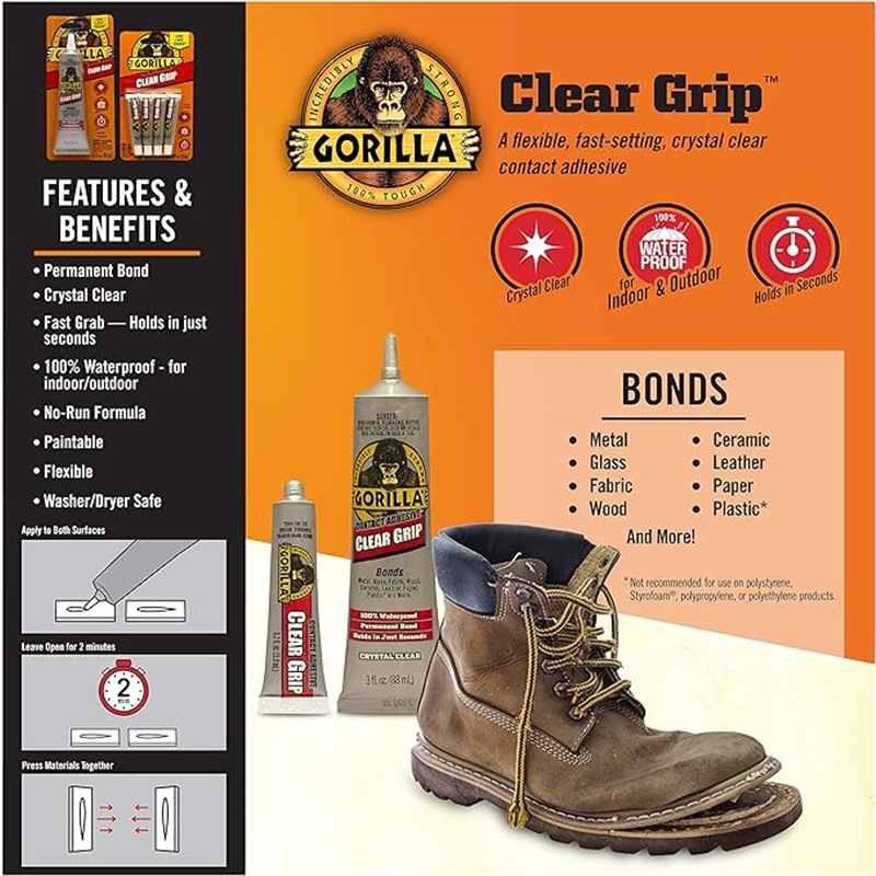 Gorilla Clear Grip is a flexible, fast-setting, crystal clear contact adhesive that creates a strong, permanent bond. Gorilla Clear Grip is paintable and waterproof making it great for projects both inside and out. Build, repair, craft.