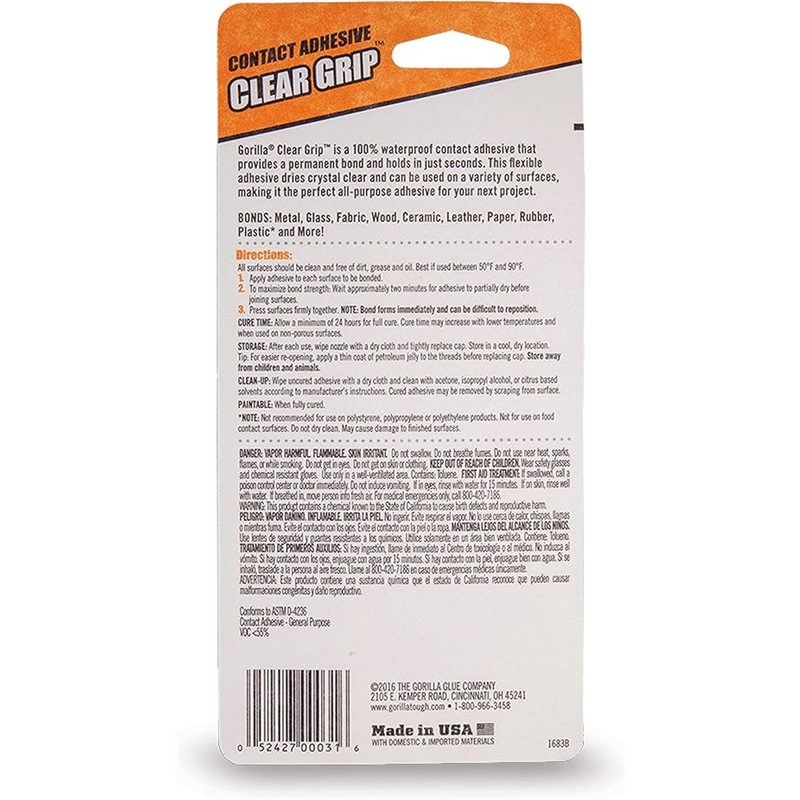 Gorilla Clear Grip is a flexible, fast-setting, crystal clear contact adhesive that creates a strong, permanent bond. Gorilla Clear Grip is paintable and waterproof making it great for projects both inside and out! Build, create, repair®!