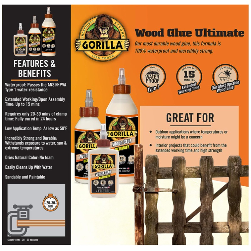 Our most durable wood glue, this Ultimate formula is 100% waterproof and incredibly strong, but still easily cleans up with water. It is great for outdoor applications where temperatures or moisture might be a concern, as well as interior projects that could benefit from the extended working time and high strength.