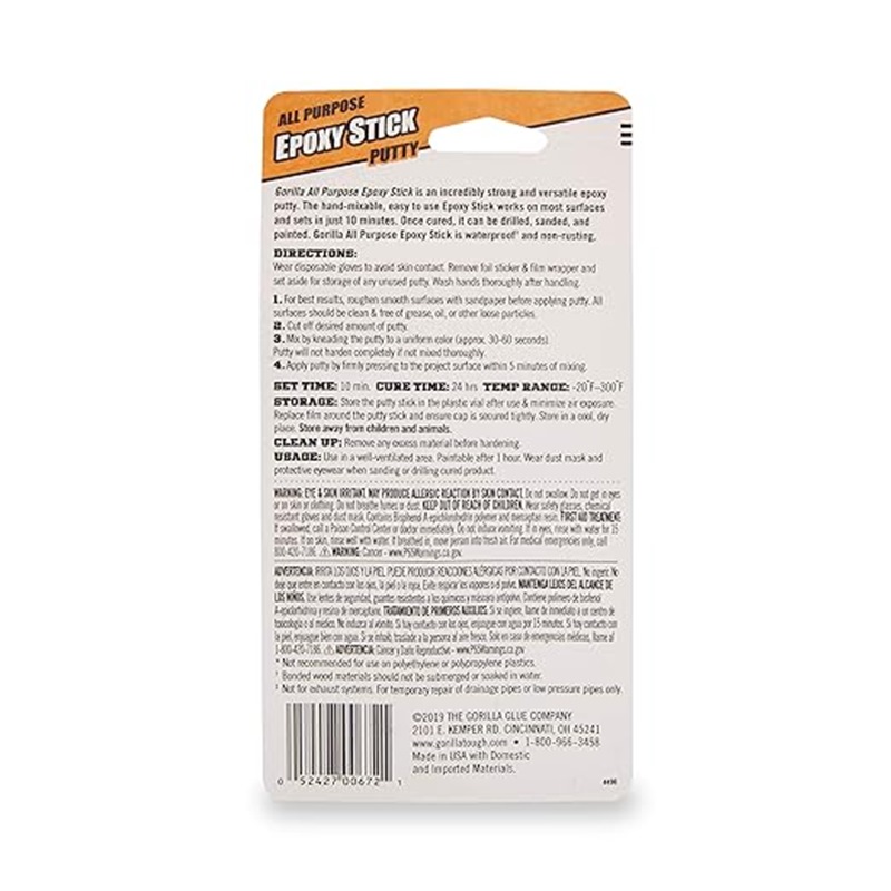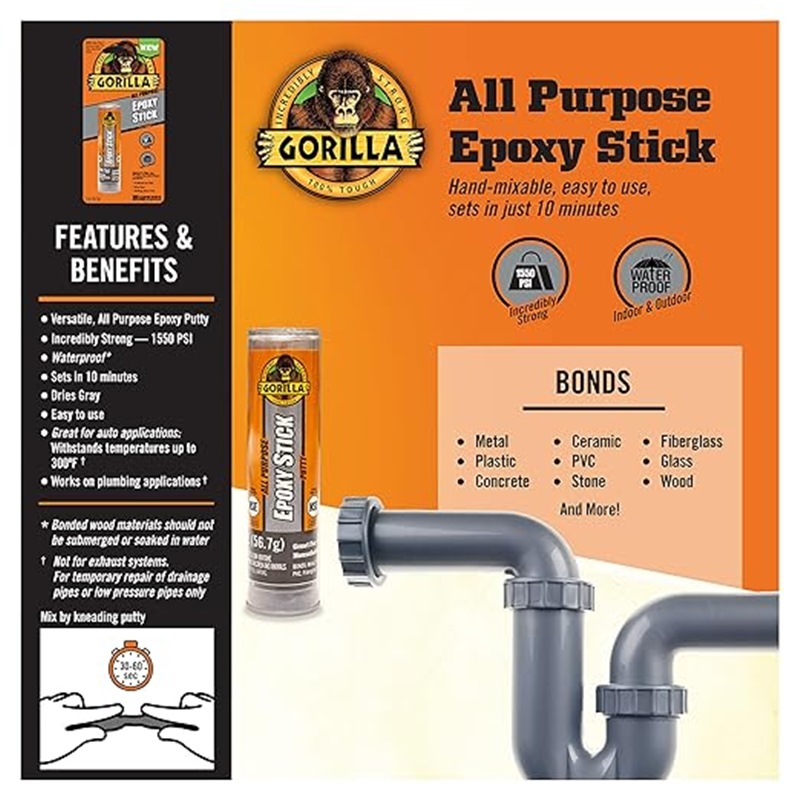 Gorilla All Purpose Epoxy Stick is an incredibly strong and versatile epoxy putty. The hand-mixable, easy to use Epoxy Stick sets in just 10 minutes and works on most surfaces. Gorilla All Purpose Epoxy Stick is waterproof†, non-rusting and once cured, it can be drilled, sanded, and painted. It’s great for auto, plumbing, household repairs and more!