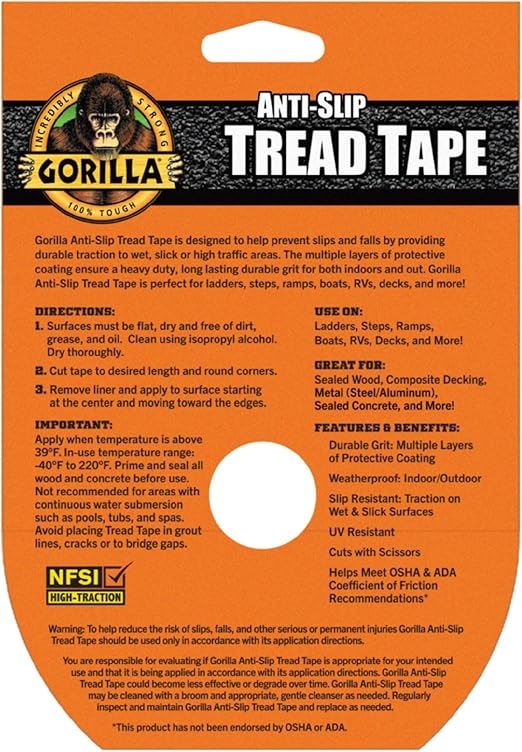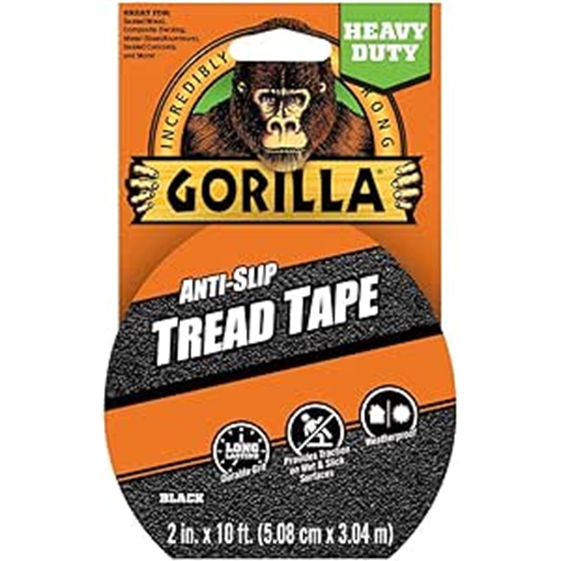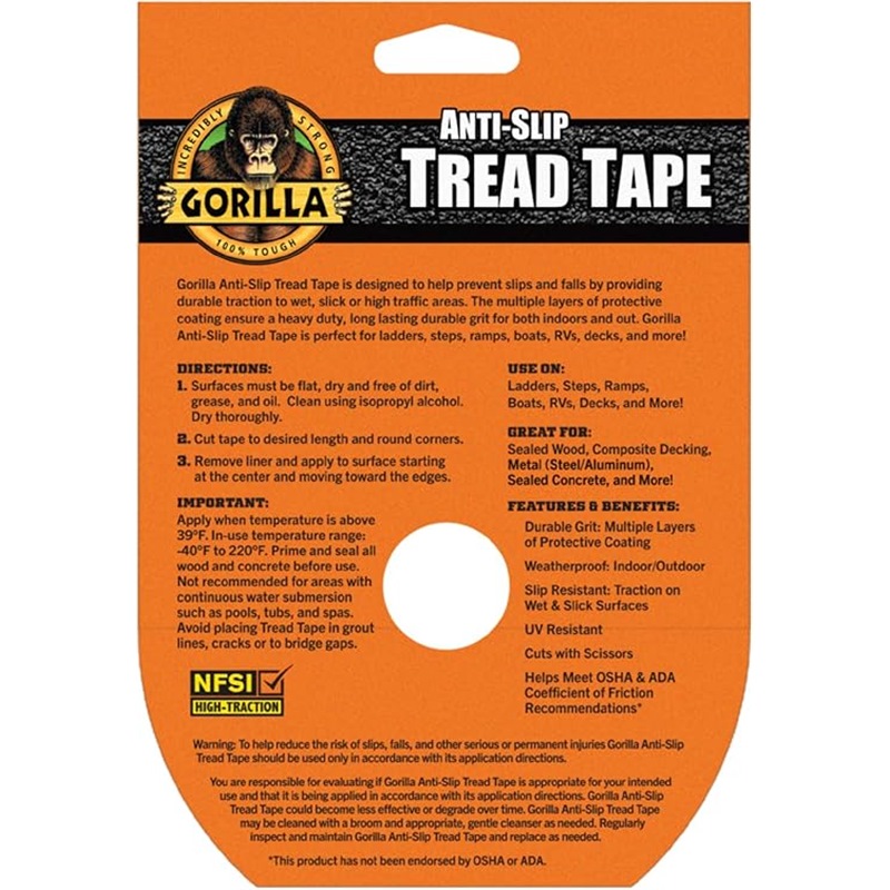Gorilla Anti-Slip Tread Tape is designed to help prevent slips and falls by providing durable traction to wet, slick or high traffic areas. The multiple layers of protective coating ensure a heavy duty long lasting, durable grit for both indoors and out. Gorilla Anti-Slip Tread Tape is perfect for steps, ramps, boats, RVs, decks, and more!