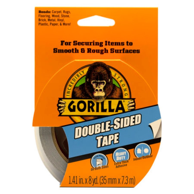 Gorilla Double-Sided Tape is made with a strong adhesive that is thick on both sides for a heavy duty bond. This tape is great for securing items indoors and out. Gorilla Double-Sided Tape sticks to smooth and rough surfaces including carpet, rugs, flooring, wood, stone, brick, metal, vinyl, plastic, paper, and more.