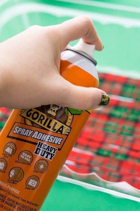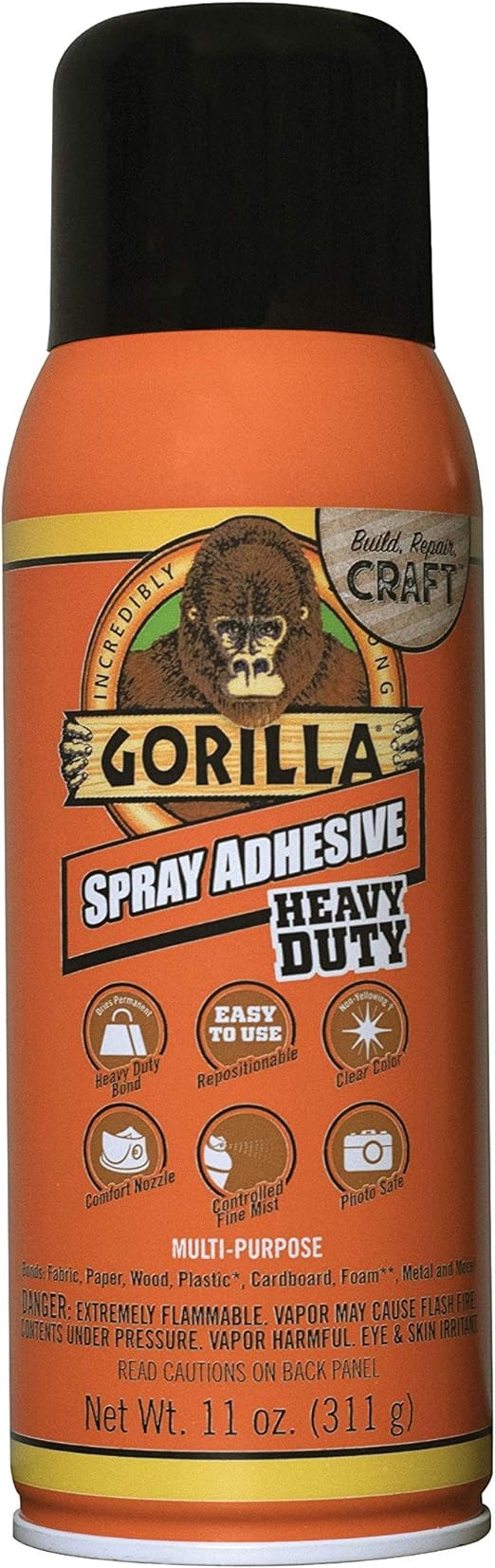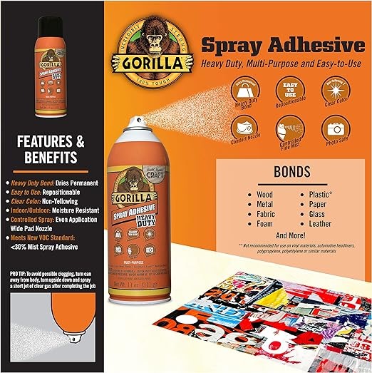Gorilla Spray Adhesive is heavy duty, multi-purpose and easy to use. Gorilla Spray Adhesive forms a clear, permanent bond that is moisture resistant and can be used on projects both indoors and out. This spray adhesive is also photo safe. Its wide pad nozzle and controlled, fine mist spray provide an even application on the project you are working on.