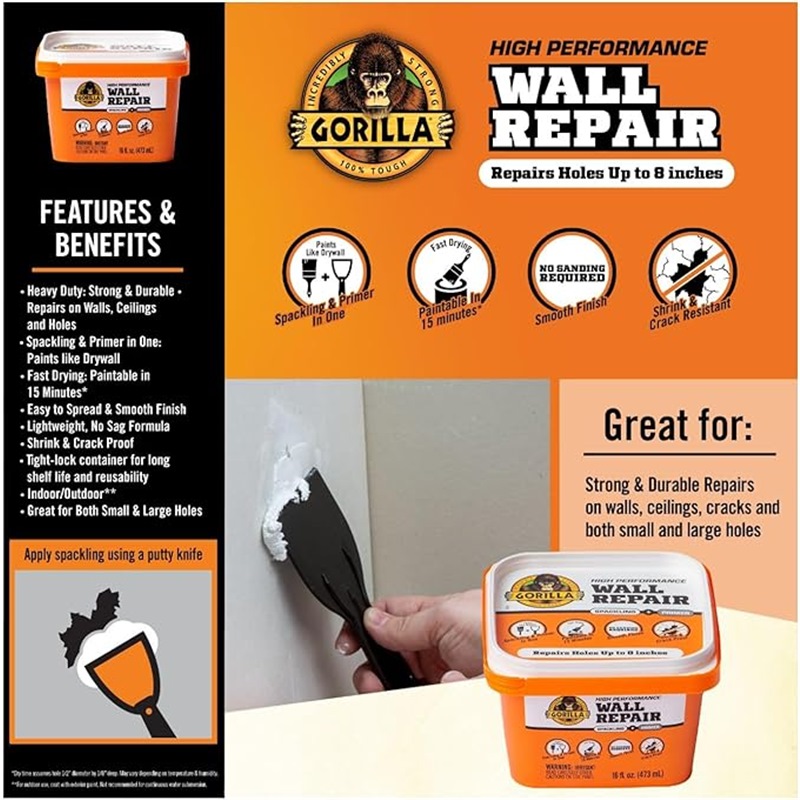 Gorilla Heavy Duty Wall Repair Spackling + Primer is the go- to product for strong, durable repairs on walls, ceilings, cracks and both small and large holes.