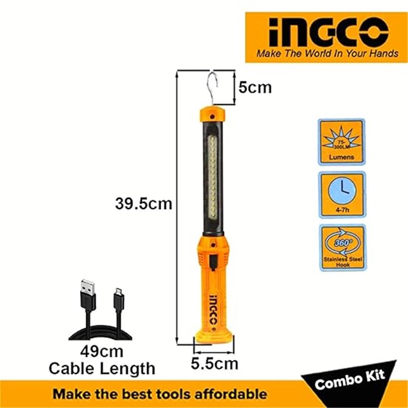 Portable Work Lamp: The combo kit includes a rechargeable lithium polymer battery-powered work lamp with adjustable lumens (Max: 300±10%, Low: 75±10%). USB Charging Capability: The work lamp comes with 1 USB charging cable for convenient charging.