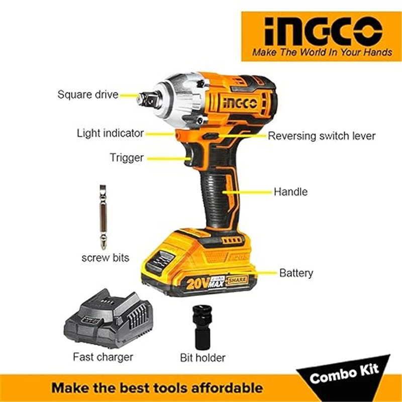 INGCO 20V IMPACT WRENCH 300NM + WORKLIGHT COMBO SET COSLI23011
