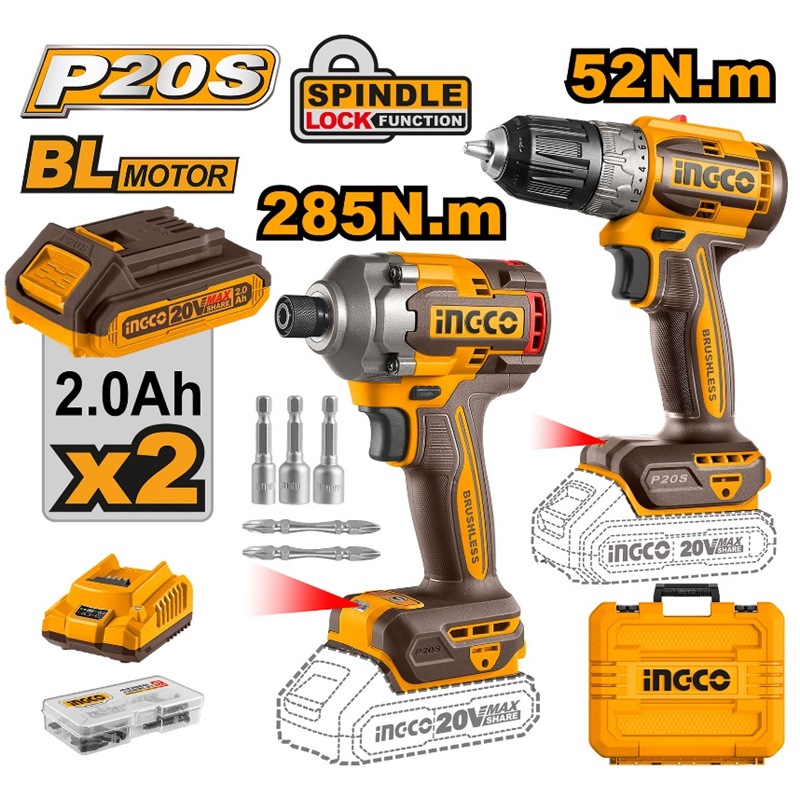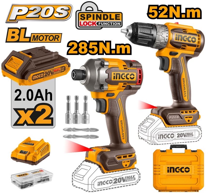 INGCO 20V IMPACT DRIVER 285NM+DRILL DRIVER COMBO 2X2.0AH+CHARGER CKLI20272