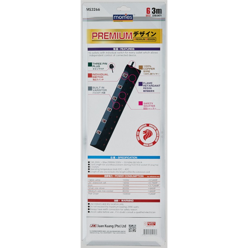 MORRIES 6WAY EXTENSION CORD 3M W/ SURGE PROTECTOR MS3266-3M/BK