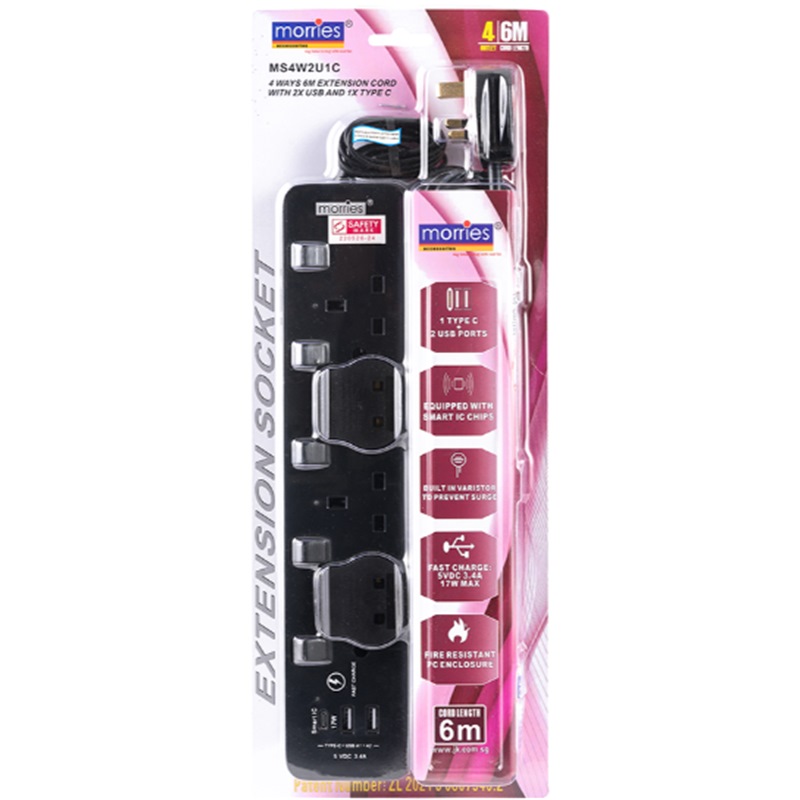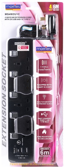 Home » Electrical & Lighting » Extension Cords & Travel Adaptors » MORRIES 4WAY 6M CORD (2USB + 1 TYPE C) MS4W2U1C/6M/BLACK