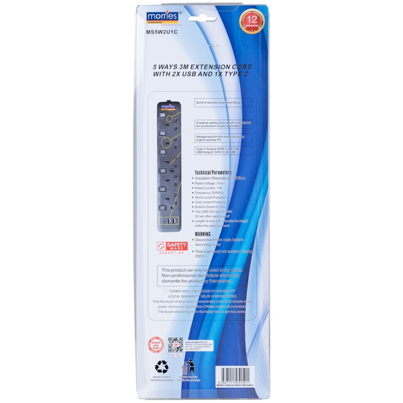 Home » Electrical & Lighting » Extension Cords & Travel Adaptors » MORRIES 5WAY 3M CORD (2USB + 1 TYPE C) MS5W2U1C/3M/BLACK