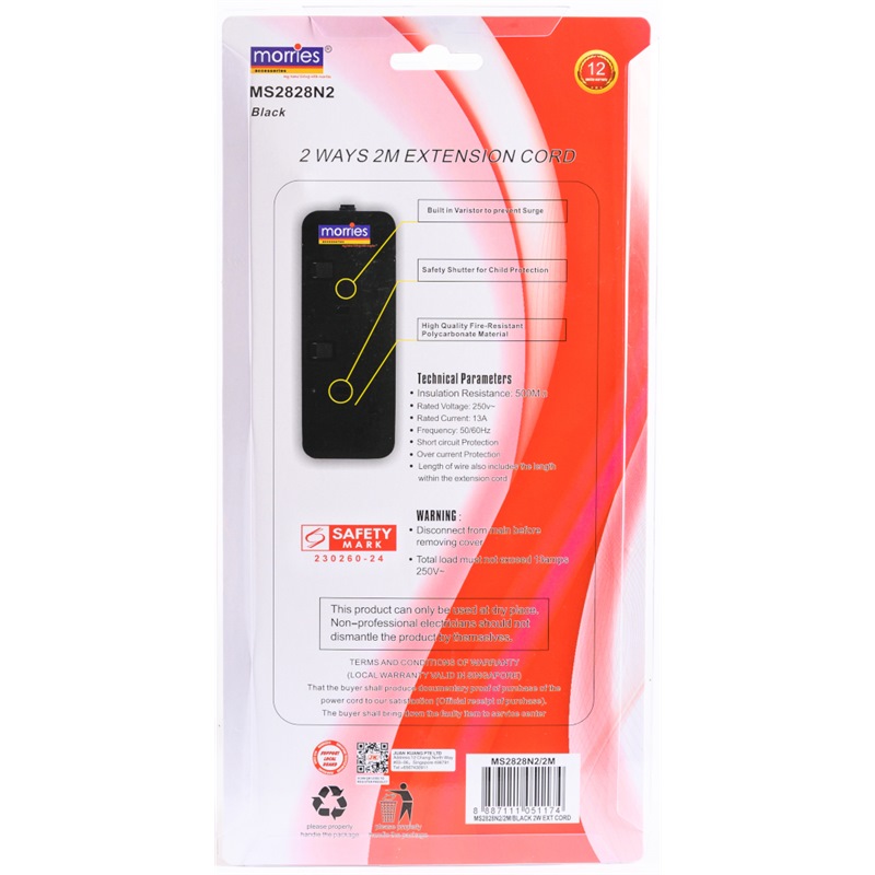 Home » Electrical & Lighting » Extension Cords & Travel Adaptors » MORRIES 2WAY EXTENSION CORD 2M W/ SURGE PROTECTOR MS2828N2
