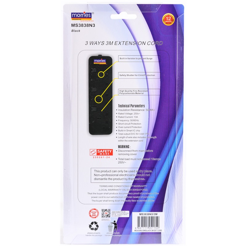 MORRIES 3WAY EXTENSION CORD 3M W/ SURGE PROTECTOR MS3838N3