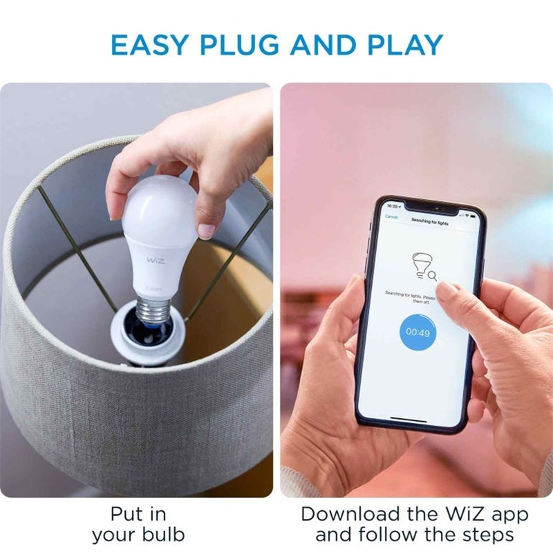 The WiZ LED A60 full color bulb brings smart lighting for your daily living. Retrofit into any lamp shade to create the ambience of your choice with 16 million colors as well as warm to cool white light. You can set schedule to turn lights on and off according to daily or weekly routines, control with your smartphone or your voice and have remote access to your lights even when you're away. WiZ lights connect to your existing Wi-Fi, no additional hardware is needed.