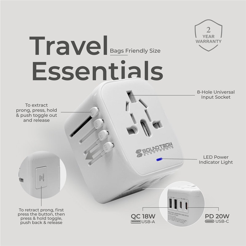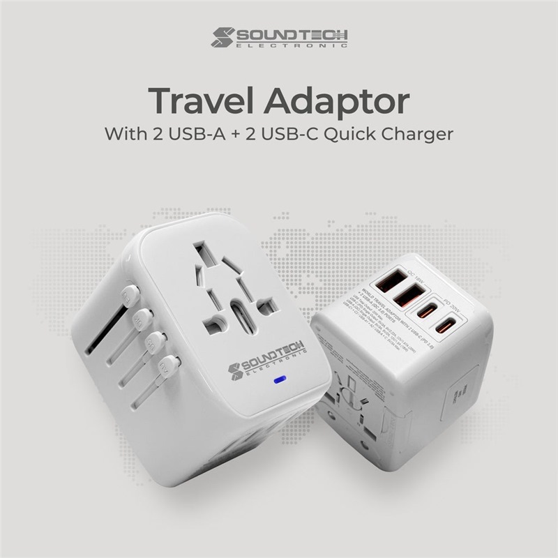 Home » Electrical & Lighting » Extension Cords & Travel Adaptors » SOUNDTECH TRAVEL ADAPTOR WITH 20W FOUR USB-A+C QUICK CHARGER TA-820