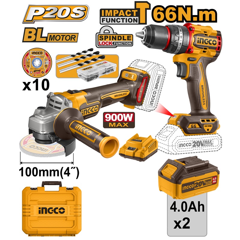INGCO 20V IMPACT DRILL & GRINDER COMBO KIT 2X4.0AH+CASE CKLI2027310