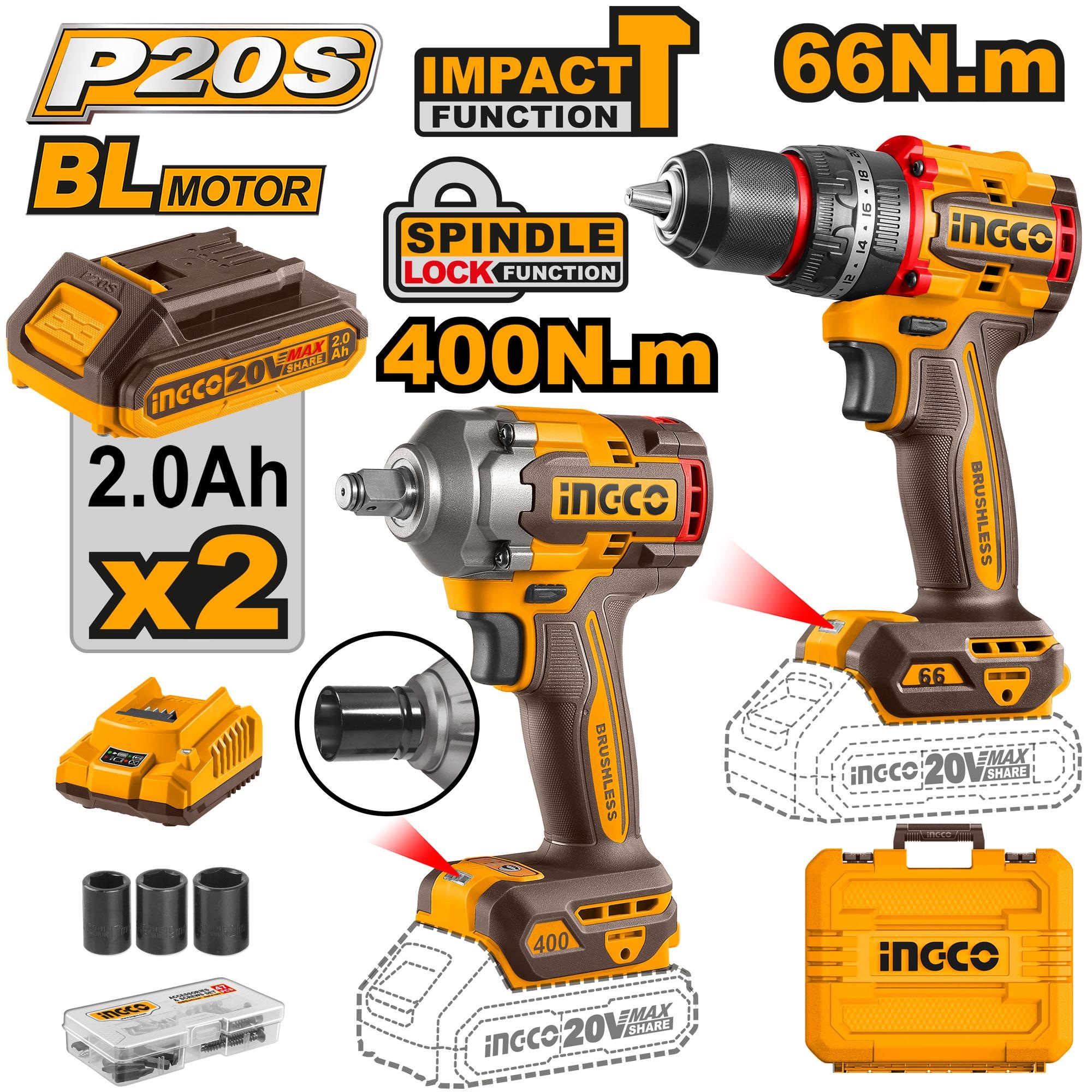 Home » Power Tools - Cordless » Combo Kits » INGCO 20V IMPACT WRENCH 400NM+IMPACT DRILL COMBO 2X2.0AH,CHARGER CKLI20275