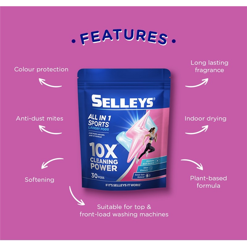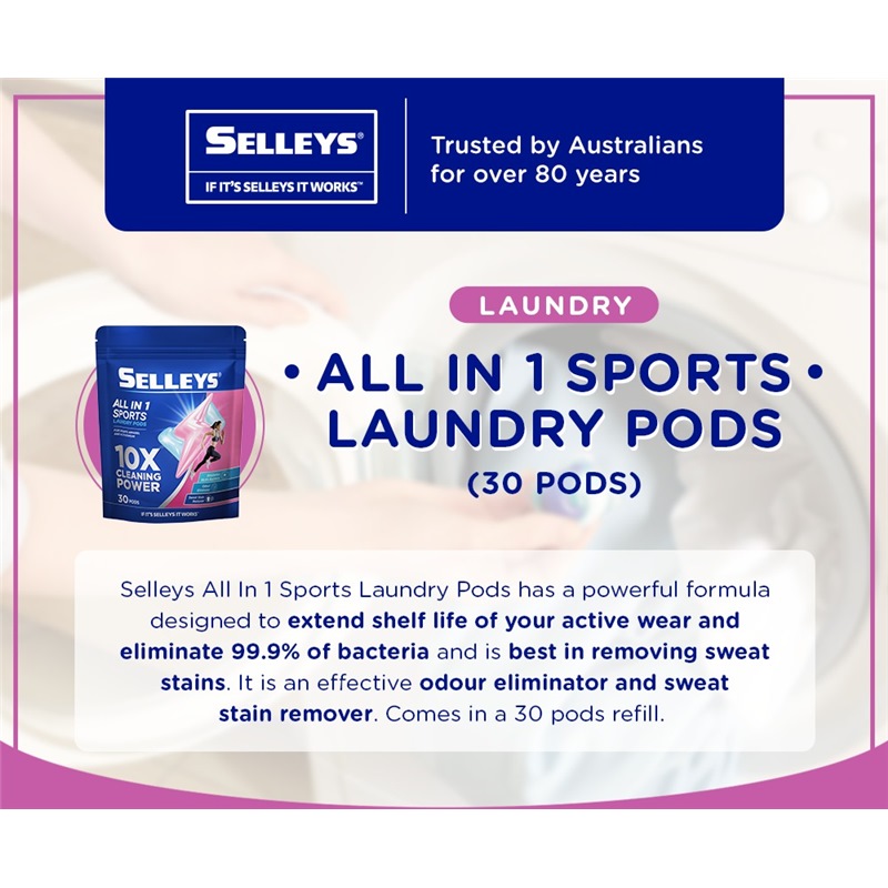 Selleys All In 1 Sports Laundry Pods has a powerful formula designed to extend shelf life of your active wear and eliminate 99.9% of bacteria and is best in removing sweat stains. It is an effective odour eliminator and sweat stain remover. Comes in a 30 pods refill.