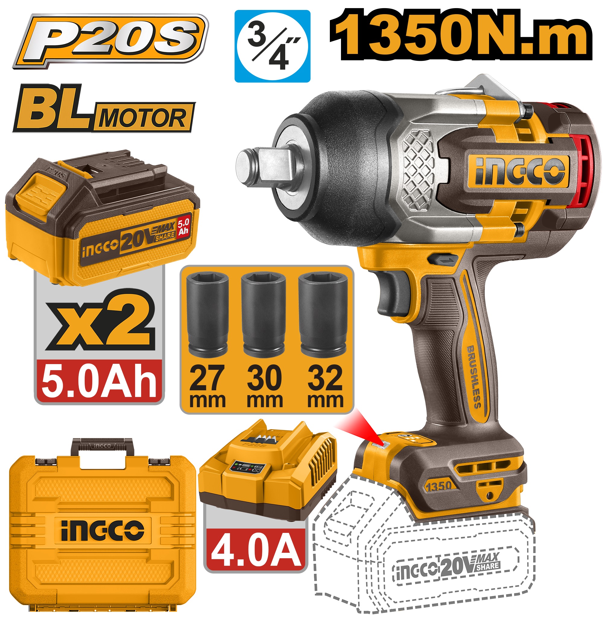 INGCO 20V BL 3/4" DR. IMPACT WRENCH MAX 1350NM 2X5.0+CHRG+CASE CIWLI20135