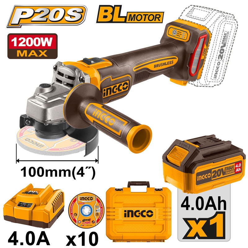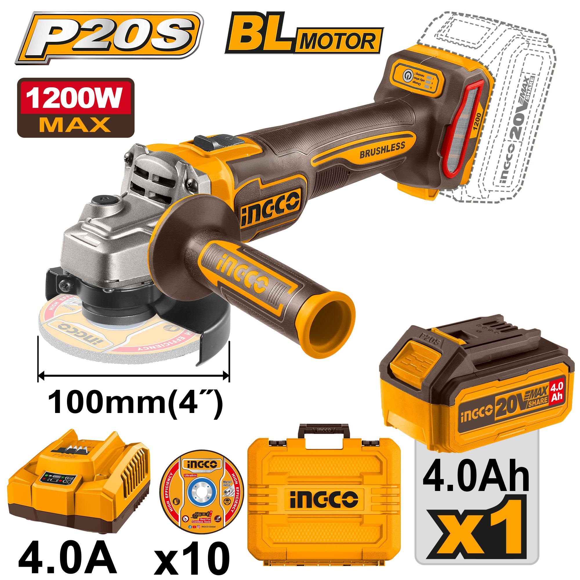INGCO 20V LI-ION 3-SPEED ANGLE GRINDER 4" 1200W 1X4.0AH+CASE CAGLI2210031