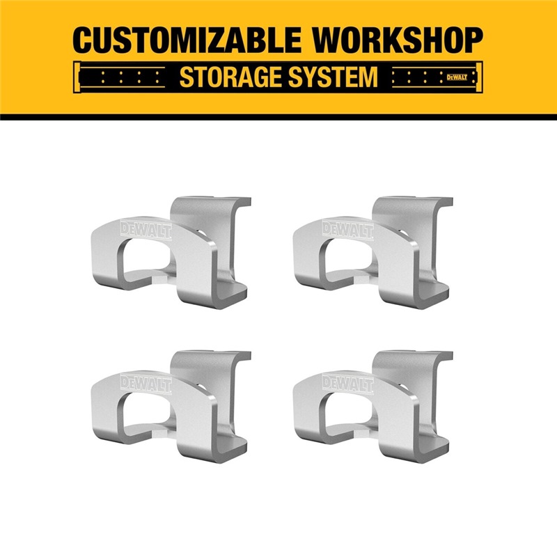 The DEWALT 4pc Cordless Hang Hook Set is part of the DEWALT Workshop Storage System and mounts directly to DEWALT Metal rail.