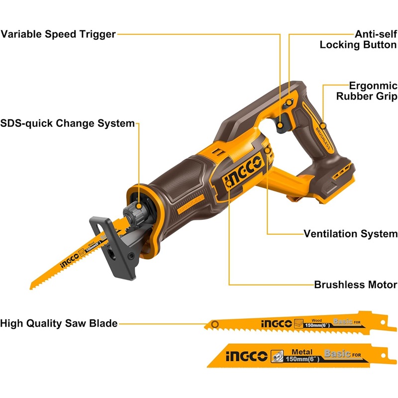 INGCO 20V LI-ION BL RECIPRO SAW CRSLI2108 (BARE UNIT)