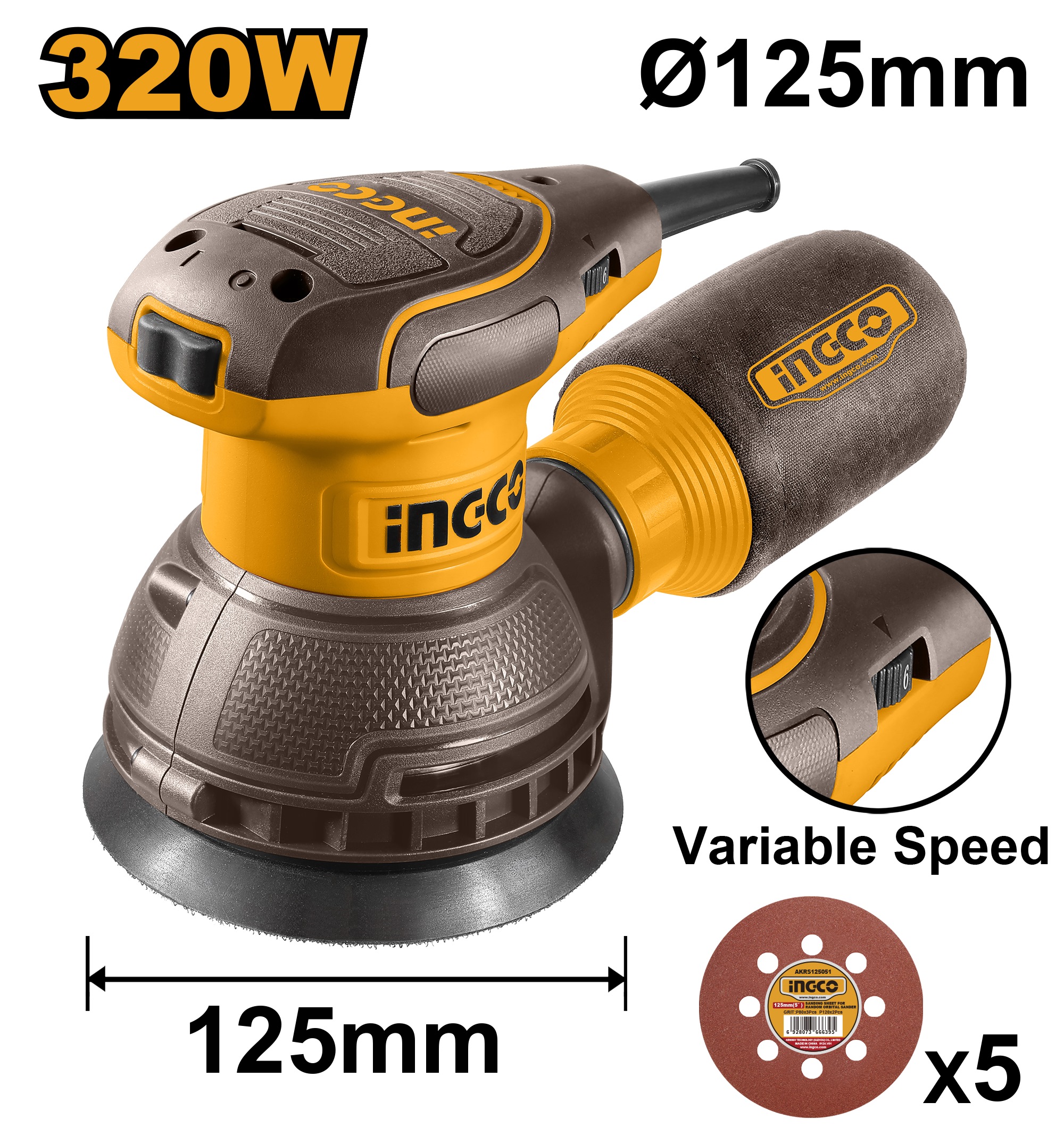 INGCO VARIABLE SPEED ELECTRIC RANDOM ORBITAL SANDER 320W 5" 125MM RS3216