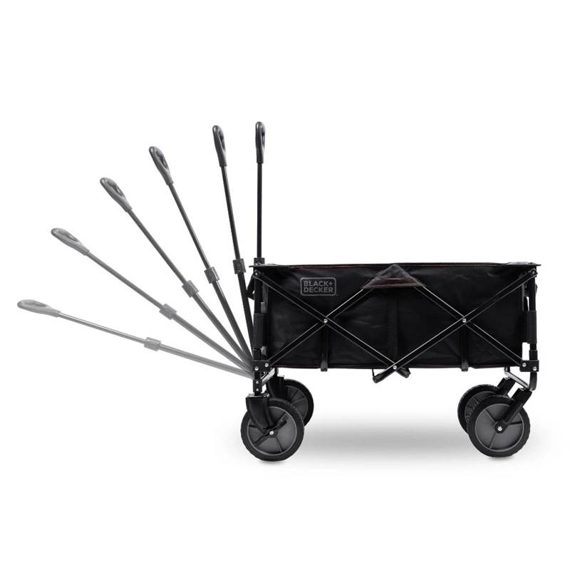 The BLACK+DECKER Collapsible Wagon is perfect for transporting your essentials and gear when you are on the go. It is a great companion for sporting events, trips to the park, farmers’ markets, camping, and a host of other outdoor activities. Use it in your backyard to haul soil and tools for gardening. Built with a sturdy frame and durable polyester canvas fabric, the wagon can handle up to 176 pounds. The collapsible wagon folds into a compact size and its handle telescopes, making it easy to store and transport. The front wheels rotate 360 degrees for added mobility and the adjustable handle allows you to pull or push the cart with ease. The wagon also features a large Velcro pocket and two cup holders to help you stay organized.