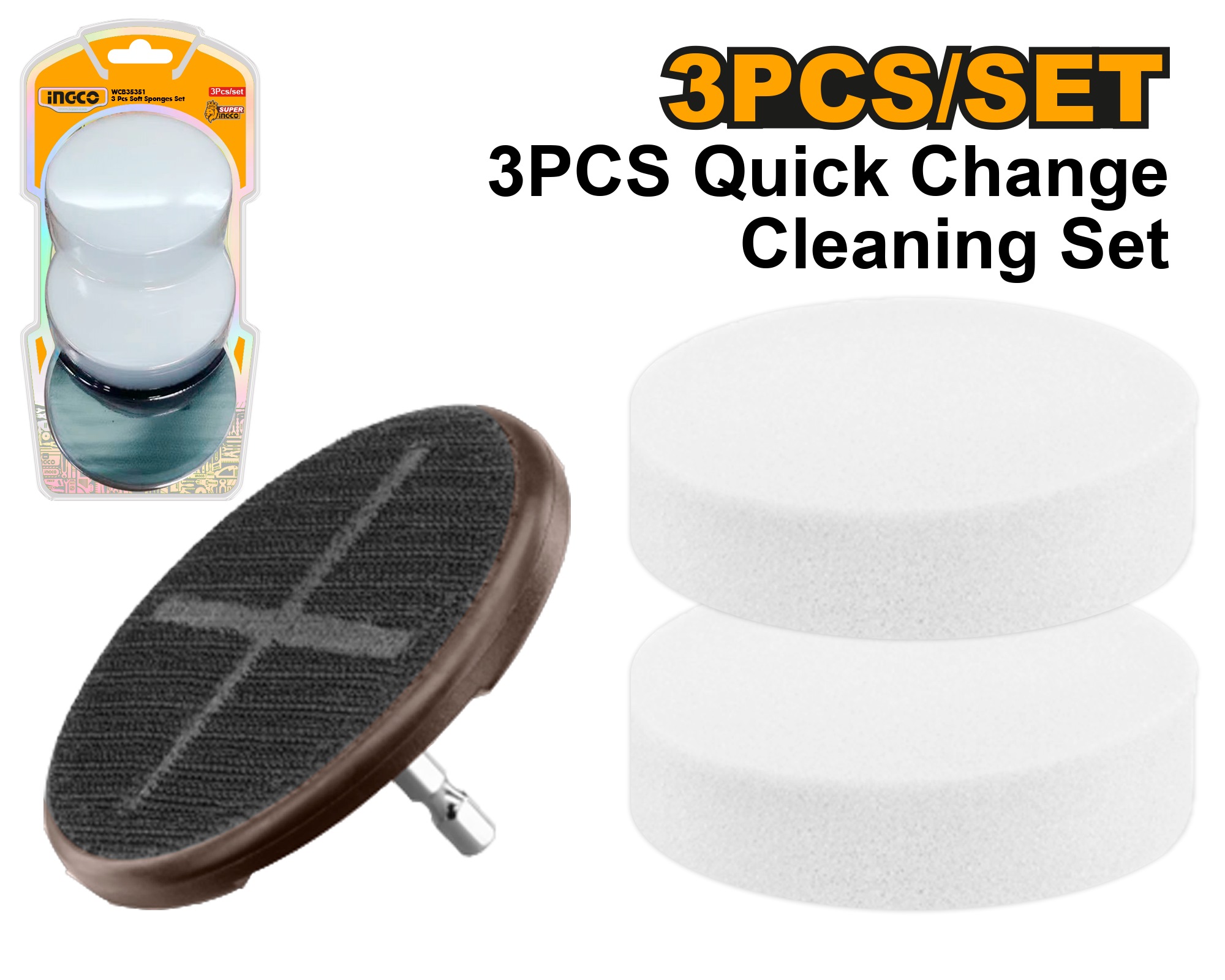 INGCO 3PCS LIGHT DUTY SOFT SPONGE SET WITH QUICK CHANGE BACKER WCB35351