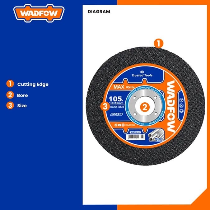 Home » Power Tools - Accessories » Abrasives » WADFOW ABRASIVE CUTTING DISC 105X1.0X16MM 15PCS IN METAL BOX WAC2L41
