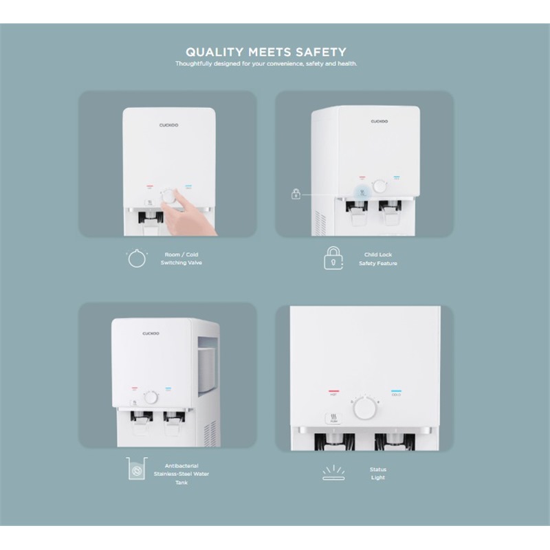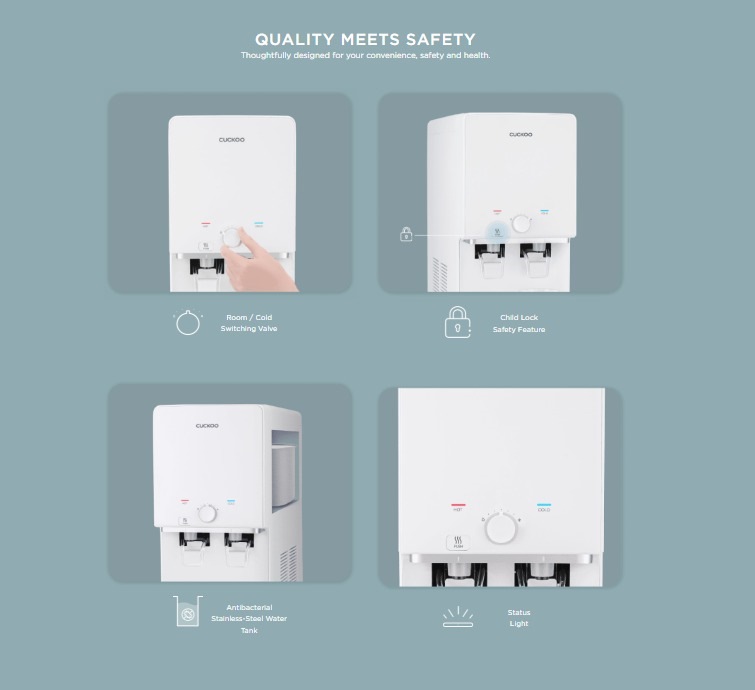 The CUCKOO KING TOP 2 has a child lock safety feature to prevent children from being scalded by hot water. This user-friendly water purifier aims to improve your home's quality of life while ensuring your family's safety. You and your child can enjoy drinking purified water conveniently and without worry.