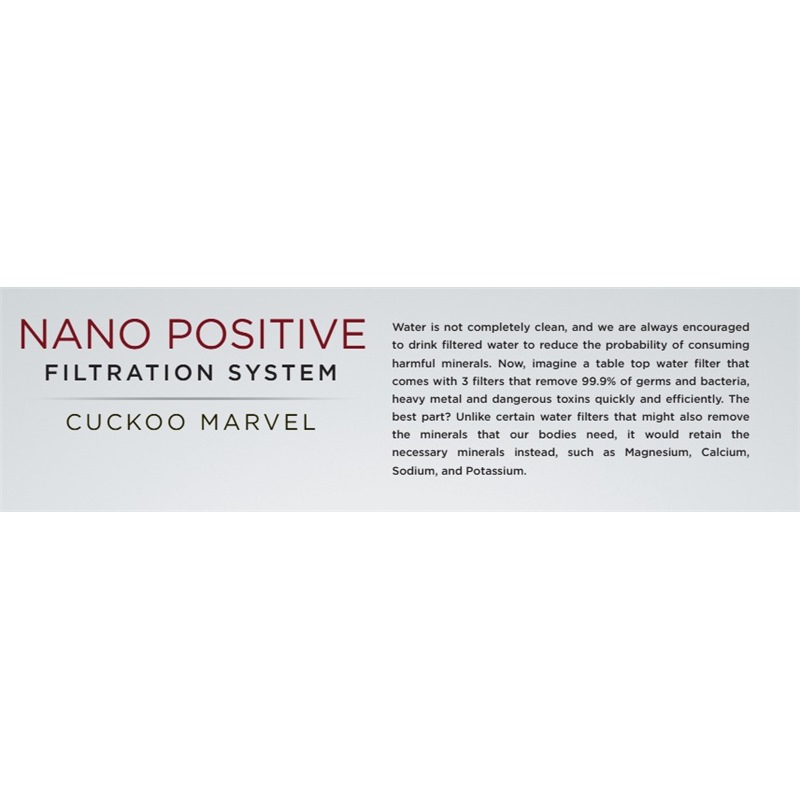 Water is not always completely clean, and we are always encouraged to drink filtered water to reduce the probability of consuming harmful minerals. Imagine a tabletop water filter that comes with 3 filters that remove 99.9% of germs, bacteria, heavy metals, and dangerous toxins quickly and efficiently. The best part? Unlike certain water filters that might also remove the minerals our bodies need, the CUCKOO MARVEL retains necessary minerals like Magnesium, Calcium, Sodium, and Potassium.